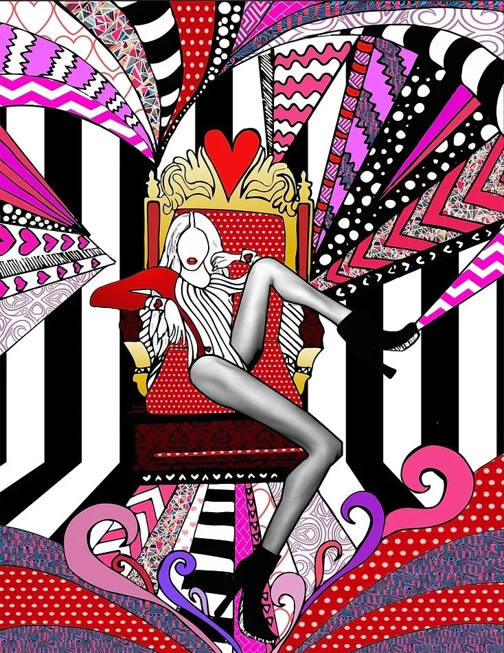 Emulating graphic designer, Nikki Farquharson's style of design, I created a Queen of Hearts playing card, combining image and animation by using pen to outline the figure, geometric shapes, and patterns, and finished using Adobe Illustrator for color and pattern creation.